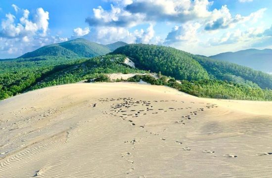 View 360°: Nhìn bao quát Đầm Ô Loan, bờ biển An Ninh Đông, và phía xa là đảo Hòn Chùa, Hòn Lao Mái Nhà.
